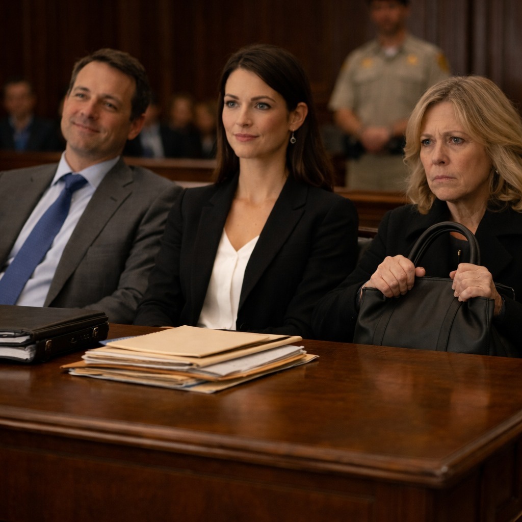 The doors were already open. I saw him first. My father was seated at the defense table, leaning back with one ankle crossed over the opposite knee, as relaxed as if he were waiting for a haircut instead of a hearing. His suit was tailored dark gray, expensive. Beside him sat the woman he left my mother for too young for that kind of confidence, dressed in cream colored wool, and a smile that didn’t reach her eyes.