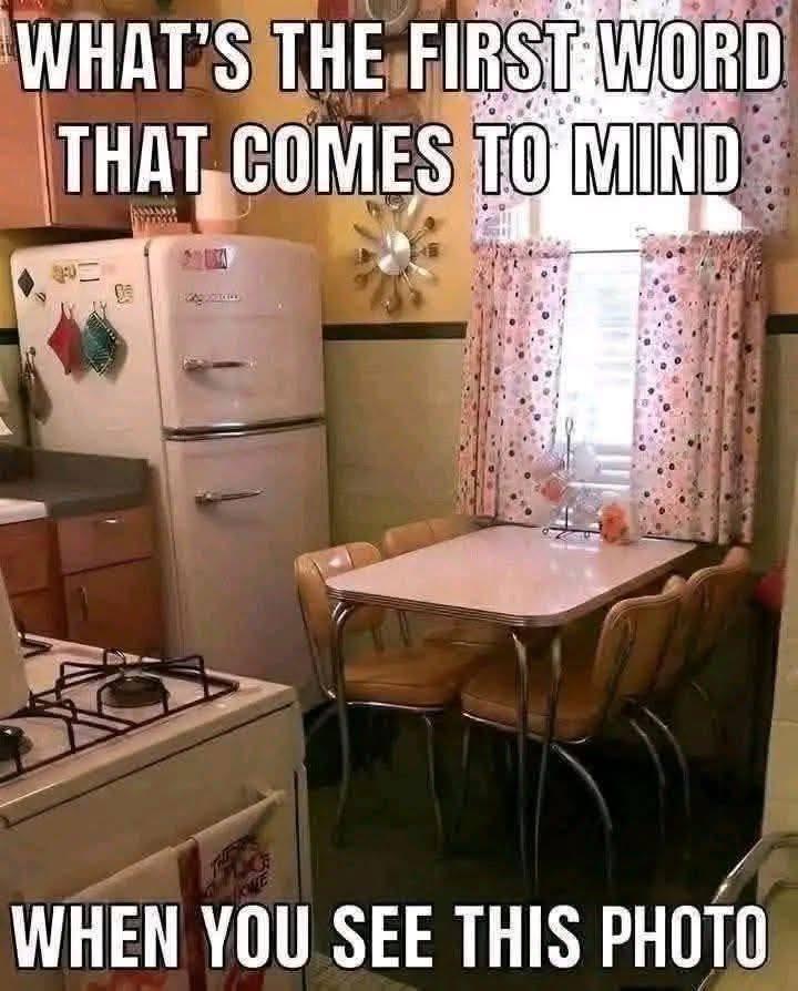 That retro kitchen setup—with the small table, vintage fridge, and patterned curtains—gives off a warm, nostalgic vibe. It feels like a place where people actually sit, talk, and share meals.